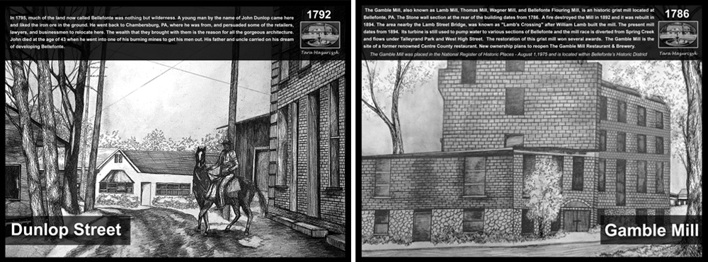 By now, you've hopefully already noticed some of these tablets that have been popping up since late 2017. A few feet in dimension and featuring original sketch renderings by local artists, the tablets stand alone, sometimes by old buildings like The Gamble Mill, and sometimes in places where the buildings are long gone, like the site of the former Bellefonte Academy.